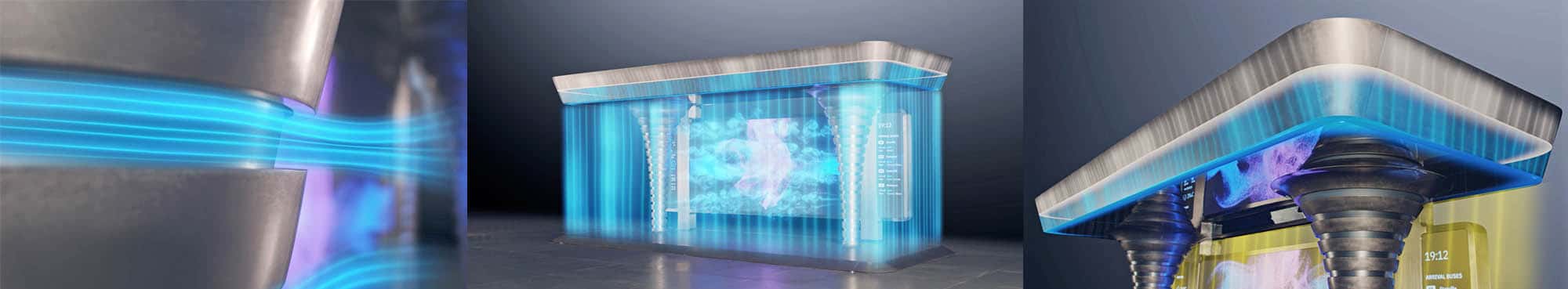 A composition of real-life footage, along with overlay motion graphics, visualize the inner working system of this innovative public infrastructure to the audience. The airflow is made of particles combined with tracked footage. This technique allowed our post-production team to give a natural look to the product while giving a clear understanding of the utility and benefits.